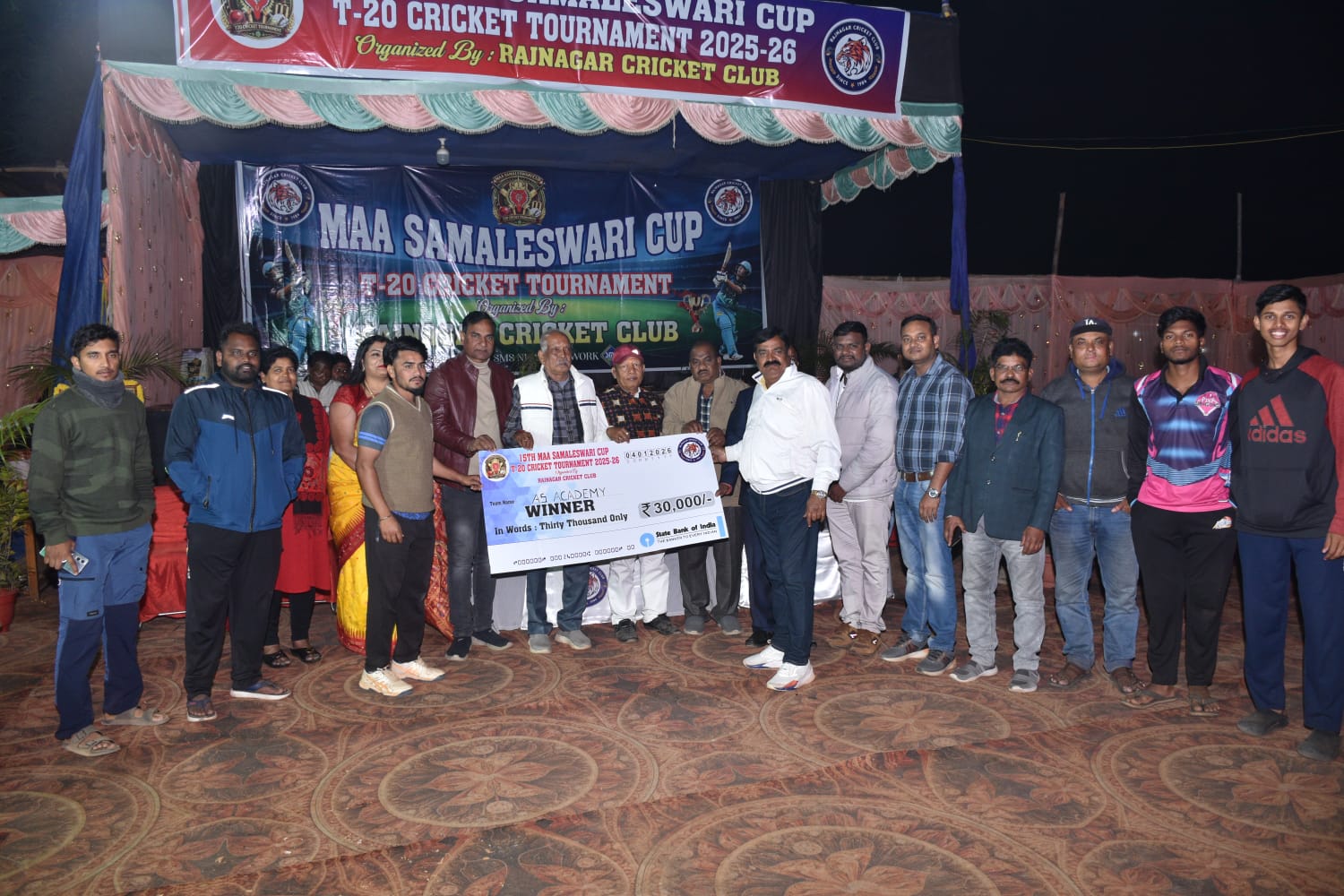 ରାଉରକେଲା:5//1,(ଉତ୍କଳ ସମାଚାର) ର ସେକ୍ଟର ୧୭ ରାଜନଗର କ୍ରିକେଟ ପଡିଆ ରେ ଚାଲୁଥିବା ୧୫ତମ ଟି-20 କ୍ରିକେଟ ଟୁର୍ଣ୍ଣାମେଣ୍ଟ ଗତକାଲି ଉଦଯାପିତ ହୋଇଯାଇଛି। ଚଳିତବର୍ଷ ଟୁର୍ଣ୍ଣାମେଣ୍ଟରେ ୧୬ଟି ଟିମ୍ ଭାଗ ନେଇଥିବା ବେଳେ ଫାଇନାଲ ମ୍ୟାଚ ଏ ଏସ ଏକାଡେମୀ ଓ ସମଲେଶ୍ଵରୀ କ୍ରିକେଟ କ୍ଲବ୍ ସେକ୍ଟର ୧୭ ମଧ୍ୟରେ ଅନୁଷ୍ଠିତ ହୋଇଥିଲା।ଏ ଏସ ଏକାଡେମୀ ଟସ୍ ଜିତି ପ୍ରଥମେ ବ୍ୟାଟିଂ କରିବା ର ନିଷ୍ପତ୍ତି ନେଇ ଆଦିତ୍ୟ ରଜିତ୍ ର ୪୫ ବଲ ରୁ ୭୩ ରନ୍ ଓ ଯୁବରାଜ ସିଂ ଙ୍କ ୨୭ ବଲ୍ ରୁ ୪୩ ରନ୍ ସହଯୋଗ ରେ ନିର୍ଦ୍ଧାରିତ ୨୦ ଓଭର ରେ ୭ ଉଇକେଟ ବିନିମୟ ରେ ୧୬୬ ରନ୍ ସଂଗ୍ରହ କରିଥିଲା। ଏହାର ଜବାବ ରେ ସମଲେଶ୍ଵରୀ କ୍ରିକେଟ କ୍ଲବ୍ ୨୦ ଓଭର ରେ ୯ ଟି ୱିକେଟ ହରାଇ ମାତ୍ର ୧୫୫ ରନ୍ ସଂଗ୍ରହ କରିବାକୁ ସମର୍ଥ ହୋଇଥିଲା।ଏ ଏସ ଏକାଡେମୀ ର କୈଳାସ ପତି ୪ ଓଭର ରେ ମାତ୍ର ୨୦ ରନ୍ ଦେଇ ୪ ଟି ମୂଲ୍ୟବାନ ଉଇକେଟ ନେଇ ବିଜୟର ମୁଖ୍ୟ କର୍ଣ୍ଣଧାର ସାଜିଥିଲେ।ଏ ଏସ ଏକାଡେମୀ ୧୧ ରନ୍ ରେ ବିଜୟ ହାସଲ କରିଥିଲା।ଉଦଯାପନୀ ଉତ୍ସବରେ ମୁଖ୍ୟ ଅତିଥି ଭାବେ ରଘୁନାଥପାଲୀ ବିଧାୟକ ଦୁର୍ଗା ଚରଣ ତନ୍ତୀ ଯୋଗ ଦେଇଥିବା ବେଳେ ସମ୍ମାନିତ ଅତିଥି ଭାବେ ସମାଜସେବୀ ହରିହର ରାଉତରାୟ, ସରୋଜ ଜେନା, ମହିଳା କ୍ରିକେଟ ଚୟନକର୍ତ୍ତା ର ଅଧ୍ଯକ୍ଷା ସସ୍ମିତା ପଟ୍ଟନାୟକ,ପ୍ରଜ୍ଞା ପରିମିତା ଦାସ, ସେଲ୍ ଏସସି ଏସଟି ସଂଗଠନ ର ସଭାପତି ଭଗବାନ ସେଠୀ ଓ ସାଧାରଣ ସମ୍ପାଦକ ଶରତ ଚନ୍ଦ୍ର ପରିଛା ଓ ପୂର୍ବତନ କାଉନସିଲର ଜର୍ଜ ଆନନ୍ଦ ପ୍ରମୁଖ ଯୋଗ ଦେଇ ବିଜେତା ଓ ଉପବିଜେତା ଦଳ କୁ ଟ୍ରଫି ସହ ନଗଦ ରାଶି ପୁରସ୍କାର ଆକାରରେ ପ୍ରଦାନ କରିଥିଲେ।ଏଥିସହ ପ୍ରତି ମ୍ୟାଚ ର ମ୍ୟାନ ଅଫ୍ ଦି ମ୍ୟାଚ, ମ୍ୟାନ ଅଫ୍ ଦି ସିରିଜ,ବେଷ୍ଟ ବୋଲର ଓ ବ୍ୟାଟ୍ସମ୍ୟାନ୍ ପ୍ରଦାନ କରାଯାଇଥିଲା। ରାଜନଗର କ୍ରିକେଟ କ୍ଲବ୍ ର ସଭାପତି ରବିନ୍ଦ୍ର ସୁନା, ସାଂଗଠନିକ ସମ୍ପାଦକ ଅସୀମ ପରିଡା, ସାଧାରଣ ସମ୍ପାଦକ ଶ୍ରୀନିବାସ ପ୍ରଧାନ, କୋଷାଧ୍ୟକ୍ଷ ଭରତ ବାଲ୍ମୀକି ଙ୍କ ସମେତ ବାଦଲ ବେହେରା, ସୁବ୍ରତ, ଅଭିଜିତ ରଜାକ୍,ଅଜୟନାଥ ଚୌଧୁରୀ ଓ ସୁନୀଲ ପ୍ରଧାନ ପ୍ରମୁଖ ଟୁର୍ଣ୍ଣାମେଣ୍ଟ ଆୟୋଜନ ରେ ପ୍ରମୁଖ ଭୂମିକା ଗ୍ରହଣ କରିଥିଲେ।ଆୟୋଜକ ଅଭିନାଶ ପ୍ରଧାନ ଓ ବିଜେତା ଟିମ୍ କ୍ୟାପଟେନ୍ ପ୍ରତିକ୍ରିୟା ଦେଇ କହିଥିଲେ