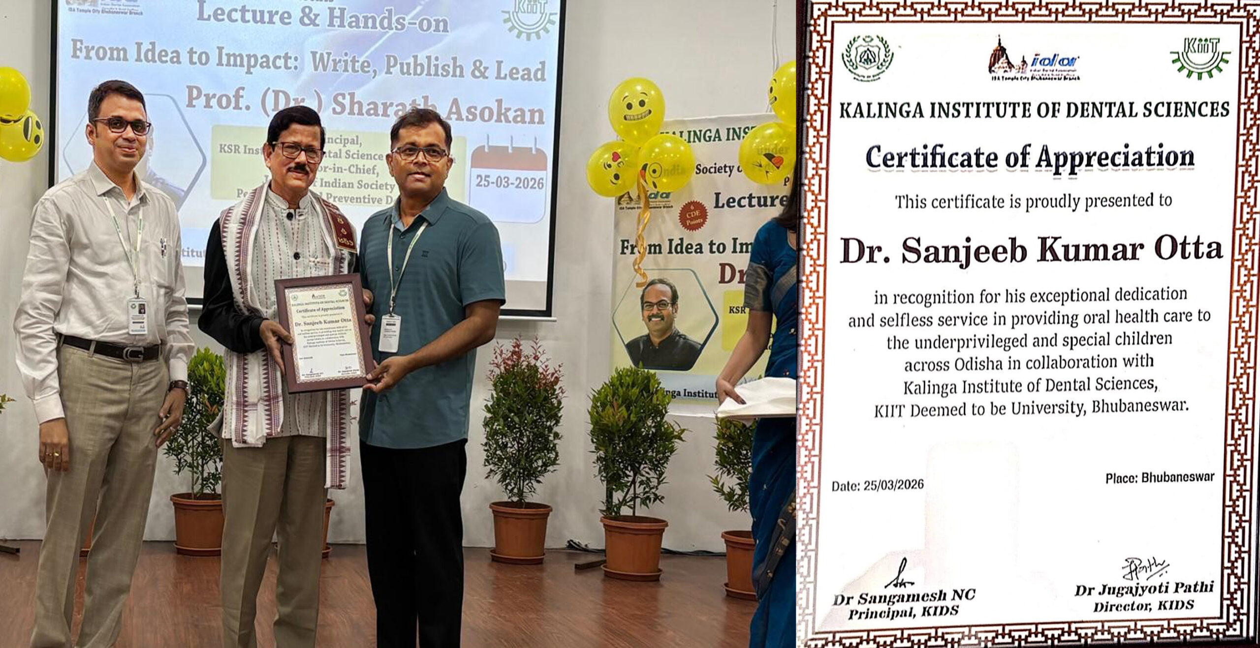 କେନ୍ଦୁଝର ୨୬/୩(ଉତ୍କଳ ସମାଚାର):: କଳିଙ୍ଗ ଇନଷ୍ଟିଚ୍ୟୁଟ ଅଫ୍ ଦାନ୍ତ ମହାବିଦ୍ୟାଳୟ,କିଟ୍ ବିଶ୍ୱବିଦ୍ୟାଳୟ ଭୁବନେଶ୍ୱର ତରଫରୁ କିଡସ୍ ପ୍ରେକ୍ଷାଳୟରେ ଆୟୋଜିତ ଏକ ସମ୍ବର୍ଦ୍ଧନା ଉତ୍ସବରେ କେନ୍ଦୁଝରର ସୁନାମଧନ୍ୟ ଦନ୍ତ ରୋଗ ବିଶେଷଜ୍ଞ ଡାକ୍ତର ସଞ୍ଜୀବ କୁମାର ଓତାଙ୍କୁ ତାଙ୍କର ସମାଜସେବା ପାଇଁ କିଟ୍ ର ପ୍ରତିଷ୍ଠାତା ଡ଼ ଅଚ୍ୟୁତ ସାମନ୍ତଙ୍କ ପରାମର୍ଶ କ୍ରମେ କିଡସ୍ ର ଡାଇରେକ୍ଟର ଡାକ୍ତର ଯୁଗଜ୍ୟୋତି ପାଠି ଓ ପ୍ରିନ୍ସିପାଲ ଡାକ୍ତର ସଙ୍ଗମେସ ଏନ.ସି. ଉତ୍ତରୀୟ ଓ ମାନପତ୍ର ଦେଇ ସମ୍ମାନିତ କରିଥିଲେ।ବରିଷ୍ଠ ଦାନ୍ତ ରୋଗ ବିଶେଷଜ୍ଞ ଡାକ୍ତର ସଞ୍ଜୀବ କୁମାର ଓତା ଅସହାୟ ଶିଶୁ ଏବଂ ଦିବ୍ୟାଙ୍ଗ ଶିଶୁ ମାନଙ୍କୁ ଓଡ଼ିଶା ସାରା ନିଜର ପ୍ରଚେଷ୍ଟା ଫଳରେ ନିୟମିତ ଭାବେ ସେମାନଙ୍କର ସେବା ଓ ସାହାଯ୍ୟ କରି ଆସୁଛନ୍ତି।ଏହିଭଳି ନିଃସ୍ୱାର୍ଥପର ସେବା ମନୋଭାବ ପାଇଁ ଡାକ୍ତର ଓତାଙ୍କୁ ସମ୍ମାନିତ କରାଯାଇଛି।ଏହି ସମ୍ବର୍ଦ୍ଧନା ଉତ୍ସବରେ ଓଡ଼ିଶାର ବିଭିନ୍ନ ଡ଼ାକ୍ତରୀ ମହାବିଦ୍ୟାଳୟରୁ ଶତାଧିକ ଛାତ୍ର ଛାତ୍ରୀ ଉପସ୍ଥିତ ଥିଲେ।ଏହି ଅବସରରେ ଡାକ୍ତର ଓତାଙ୍କୁ ବିଭିନ୍ନ ମହଲରୁ ଶୁଭେଚ୍ଛା ଜ୍ଞାପନ କରାଯାଇଛି।ଜିଲ୍ଲା ଏନସିସି ଜୁନିଅର କମାନଡ଼ିଂ ଅଫିସର ରୋଟାରିଆନ ବିଜୟ କୁମାର ବେହେରା ମଧ୍ୟ ବ୍ୟକ୍ତିଗତ ଭାବେ ଭେଟି ଶୁଭେଚ୍ଛା ଜ୍ଞାପନ କରିଛନ୍ତି